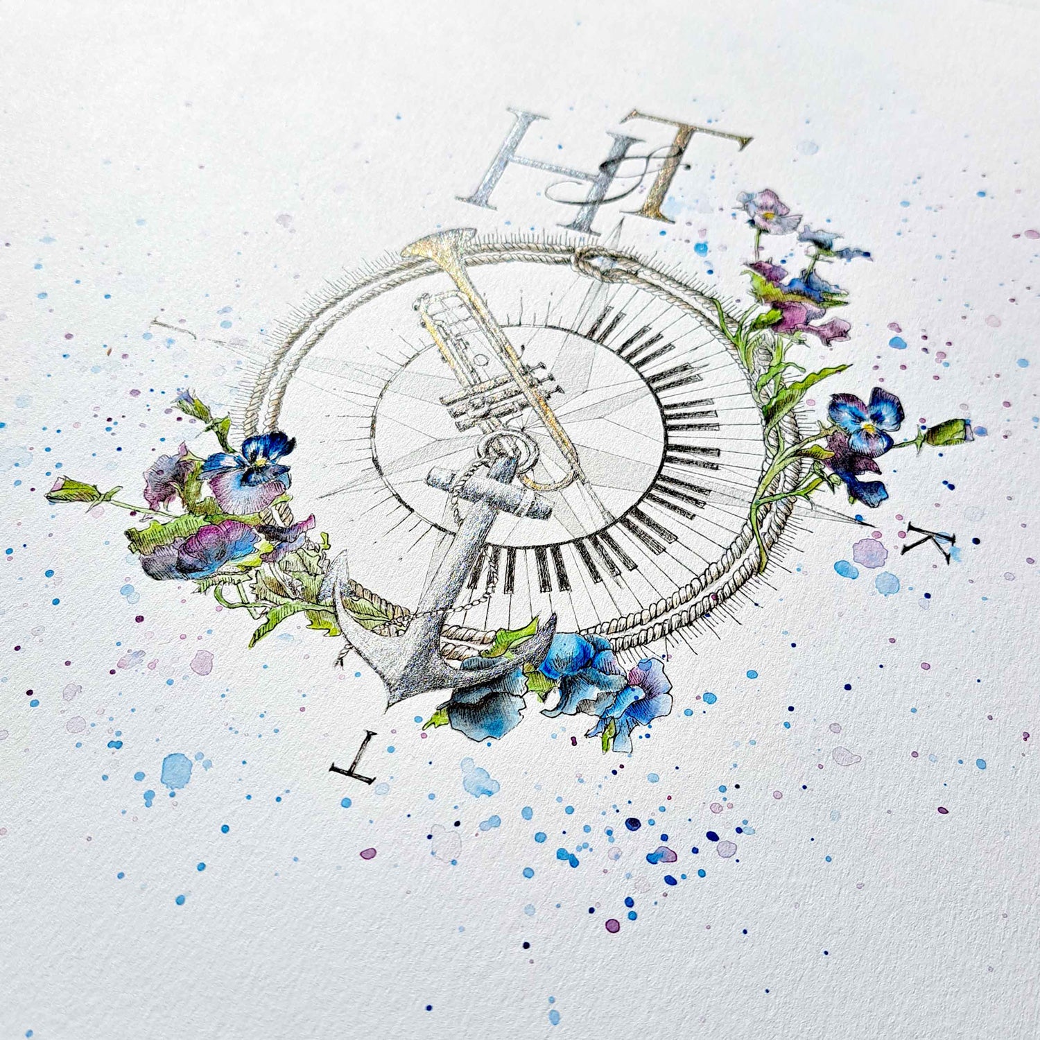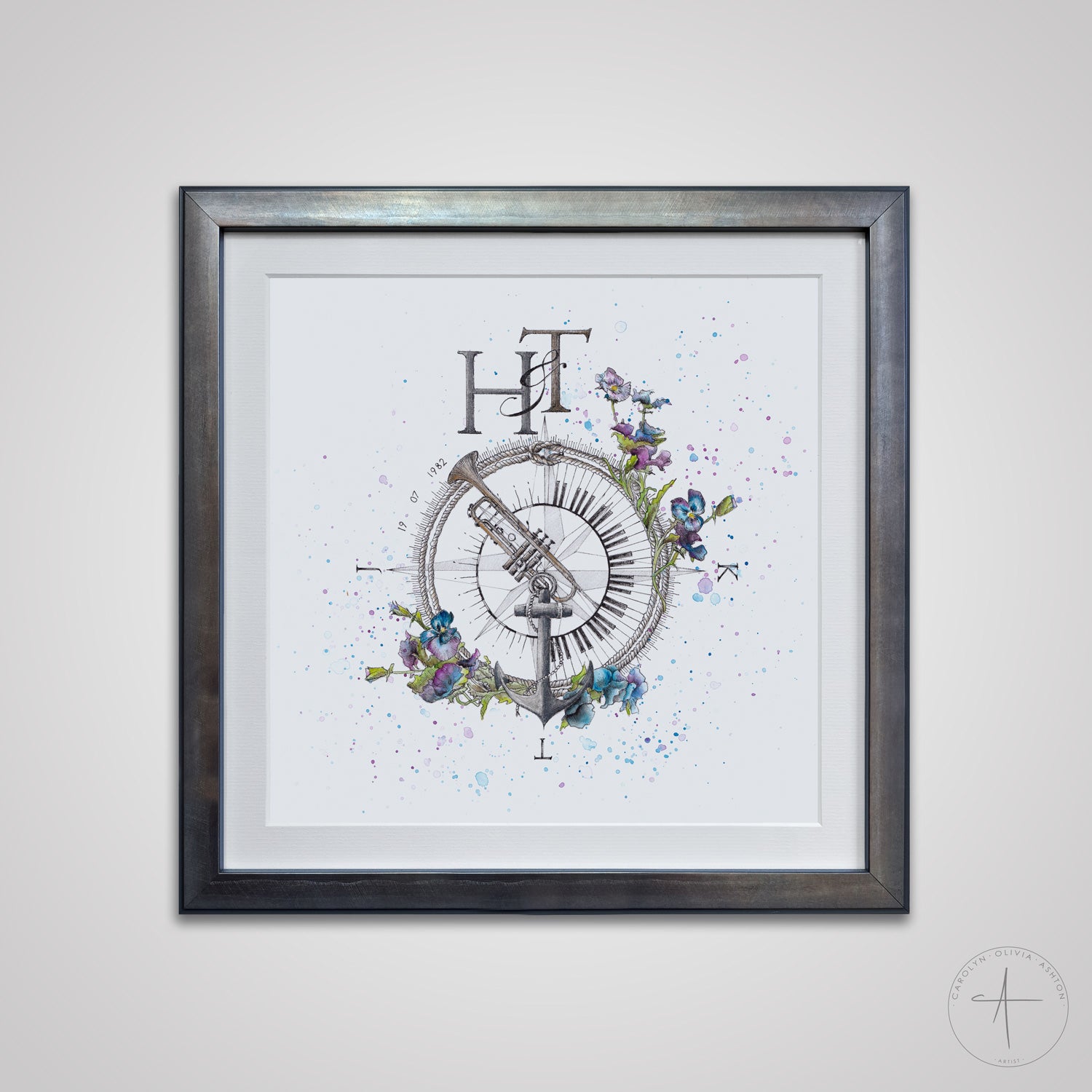 Bespoke personal drawing to illustratively represent a couple, wedding, anniversary, milestone etc. - surrounding imagery, text customisable to suit requirements.